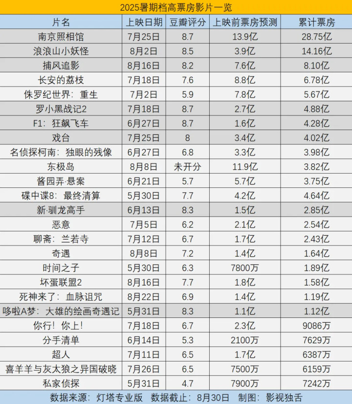 扫尾呢,本年暑期档不仅新片供给充足,莫得闹片荒,何况还出现了总票房瞻望能碎裂30亿的《南京影相馆》、16亿的《浪浪山小妖魔》。