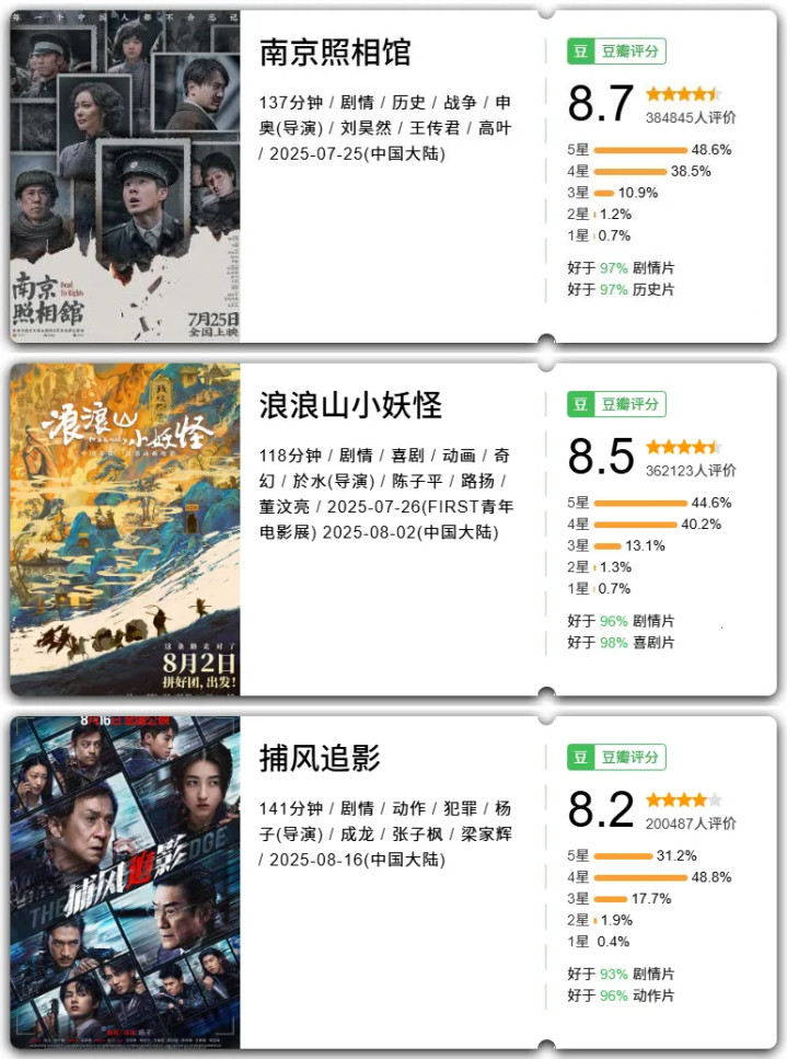 另一方面,对比往年的暑期档,咱们会发现本年暑期档是较为健康、合理的一次。票房榜前三名,豆瓣评分分别达到了8.7、8.5、8.2。