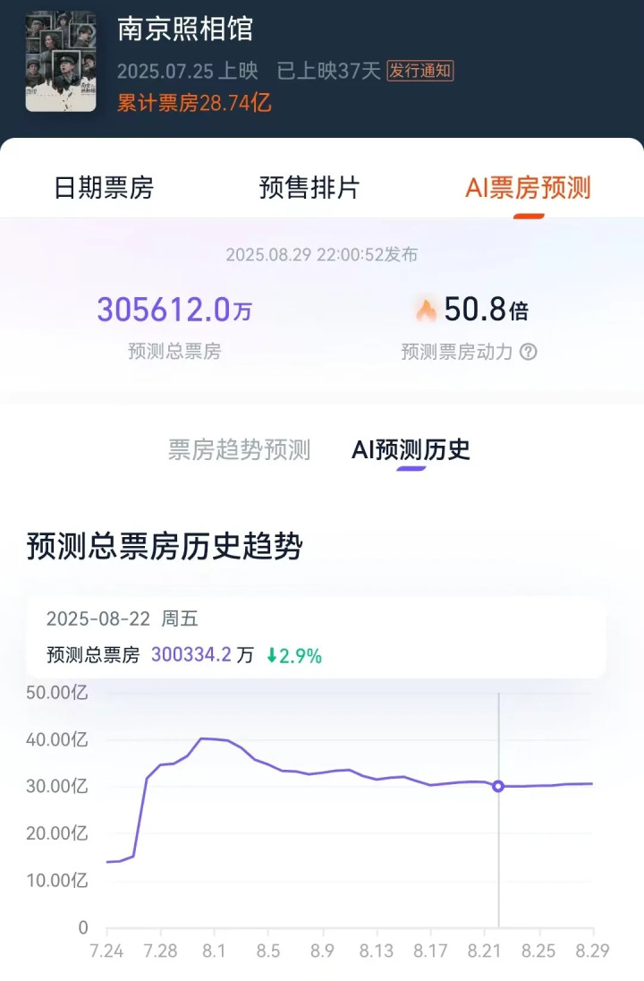 然则《南京影相馆》上映后,乘着豆瓣开分超8分的东风,蓦地火遍寰球。AI的预测总票房整夜间从十几亿上调到了三十几亿。