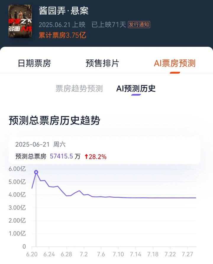 《酱园弄·悬案》的映前预测总票房为5.7亿,依然算是零星保守了。然则映后豆瓣分平稳到5.7后,票房融会光显越发乏力,最终只收得3.75亿。
