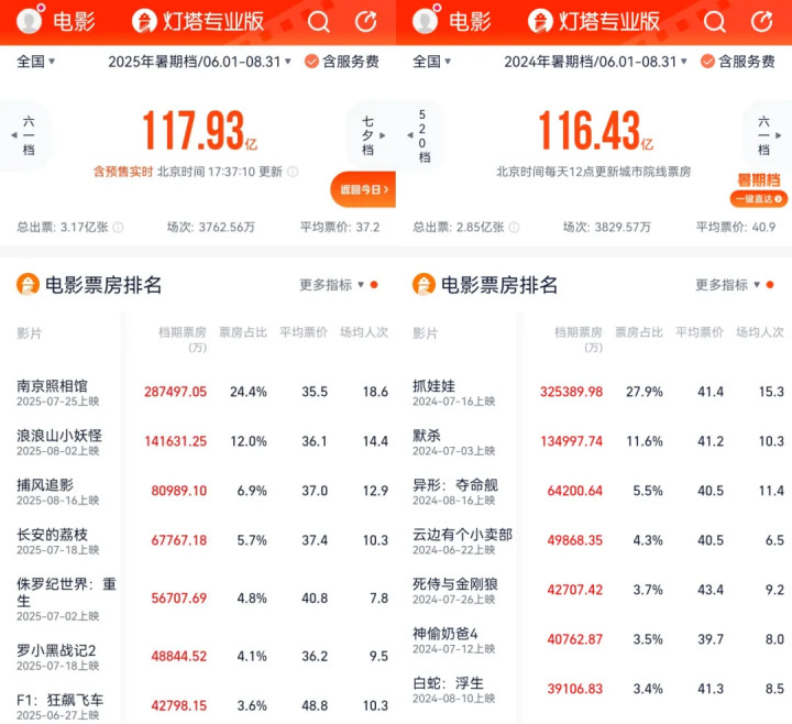凭借七夕节两部爱情新片的带动,2025年暑期档总票房终于超越了2024年。诚然与2023年创下的影史记载(206.2亿东说念主民币)相去甚远,但最终近120亿元成绩的饱读动兴味和提振遵守相等之大。