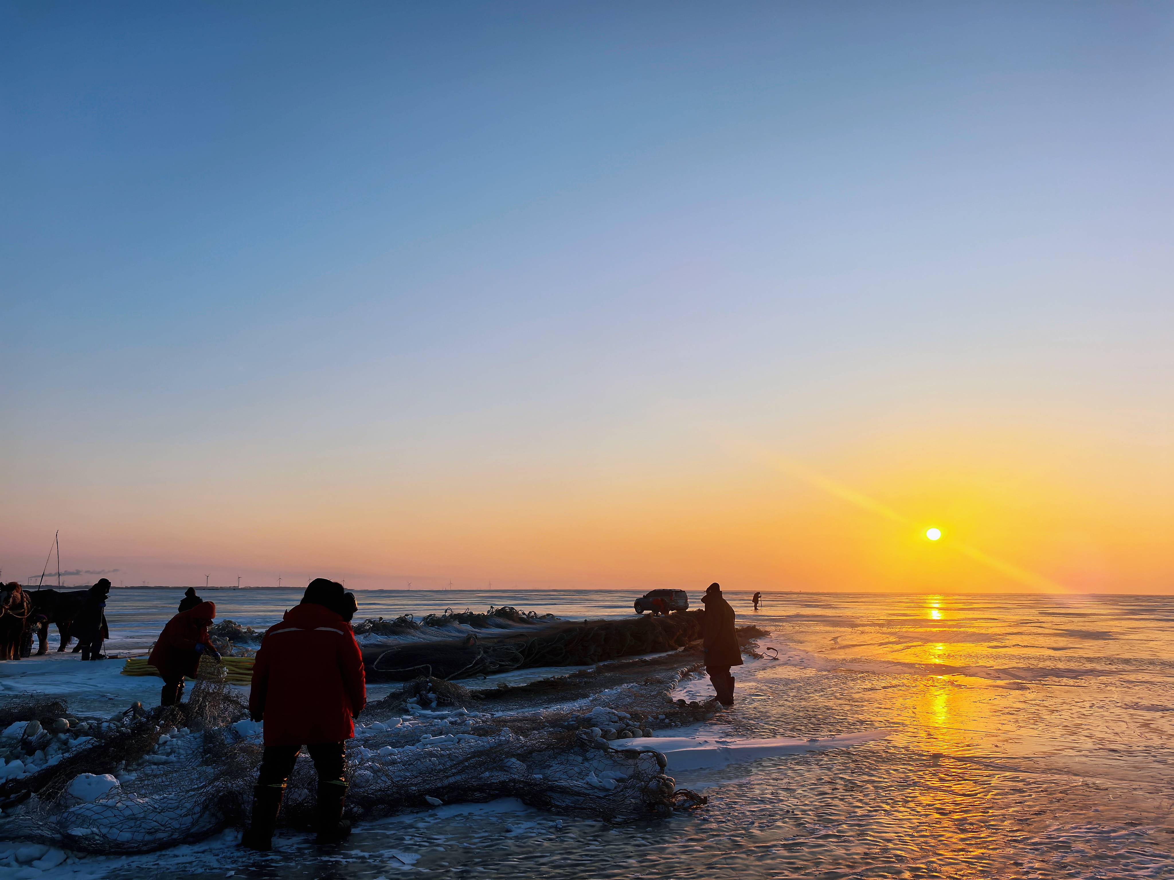 早晨,渔民们在查干湖冰面上整理渔网,准备驱动一天的冬捕。新华社记者 孙鹏程 摄湖面上,零下二十几摄氏度的气温,疏通卷着冰碴呼啸而来的寒风,不俄顷就把东谈主的脸吹得生疼,让东谈主作为活动贫困。这么的严寒,关于渔把头和渔民们来说已是家常便饭。