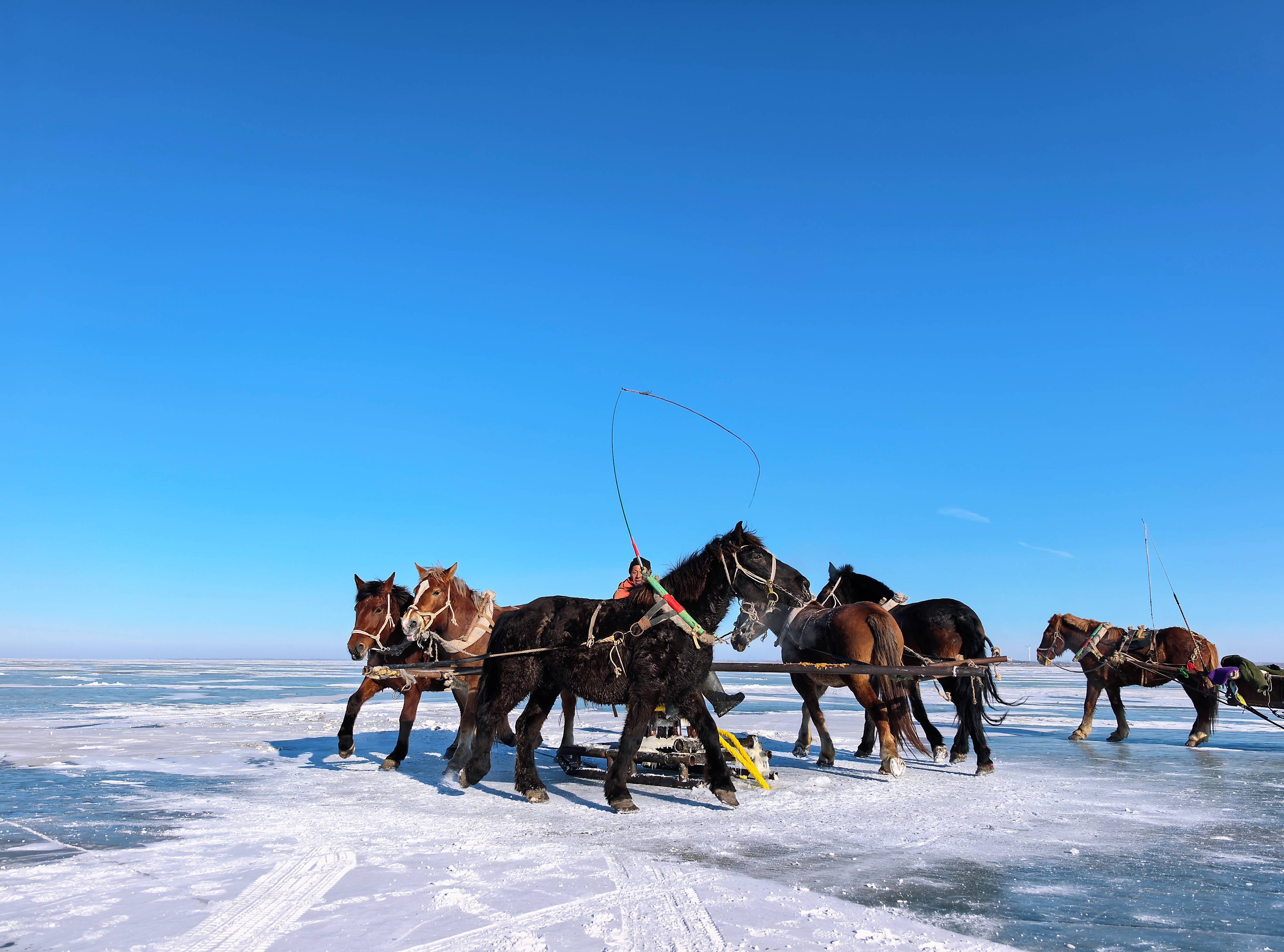 经过几小时恭候,相近中午,是时刻收网了。这个设施由东谈主和马共同完成,依靠马拉绞盘。由于渔网有几千斤重,渔人们把五匹骏马系在绞盘上,让马儿们像在磨坊里拉磨石相同围着绞盘驰驱。渐渐地,聚首渔网的穿杆被拉了上来,收紧的大网也随之被拉出冰面。