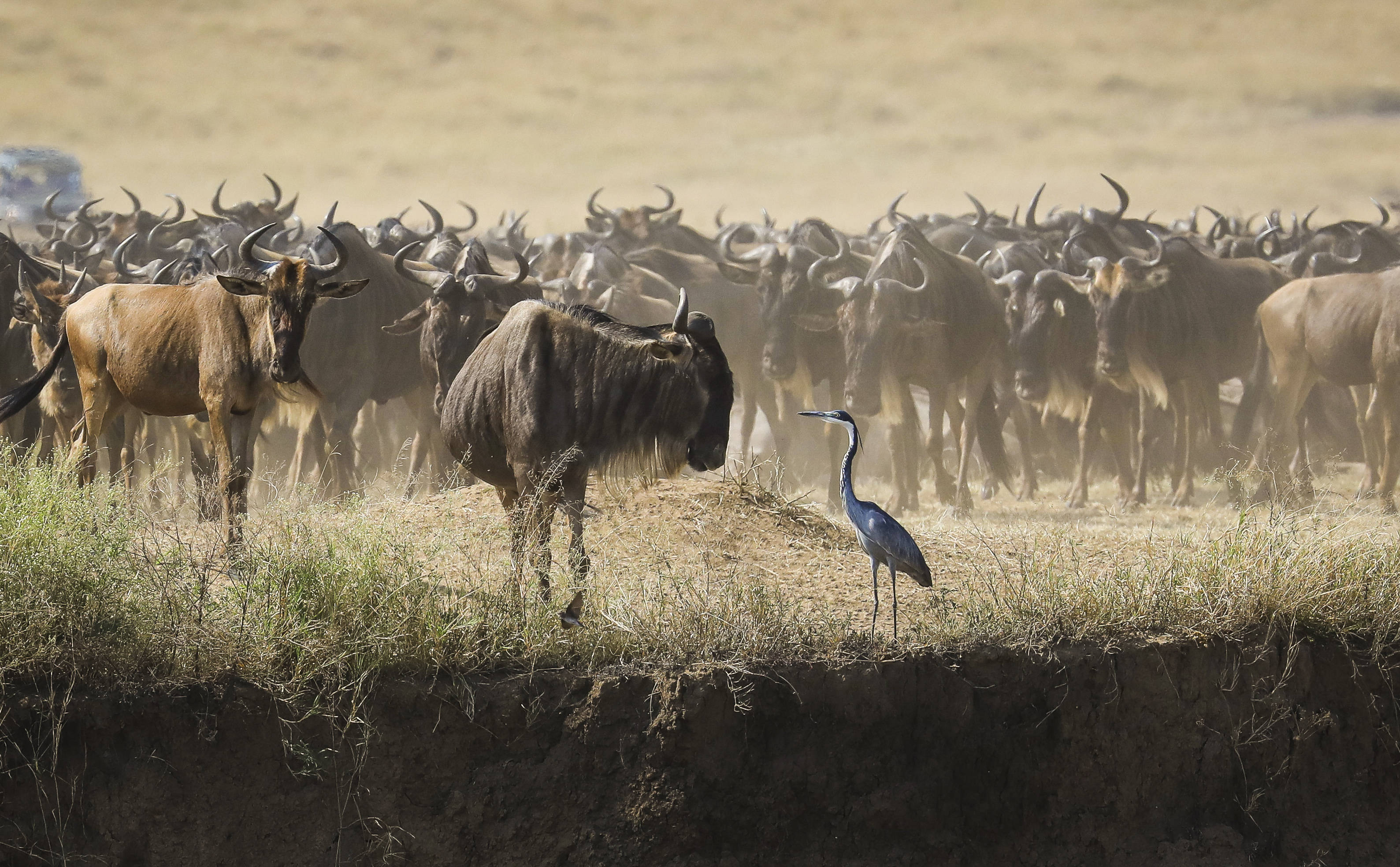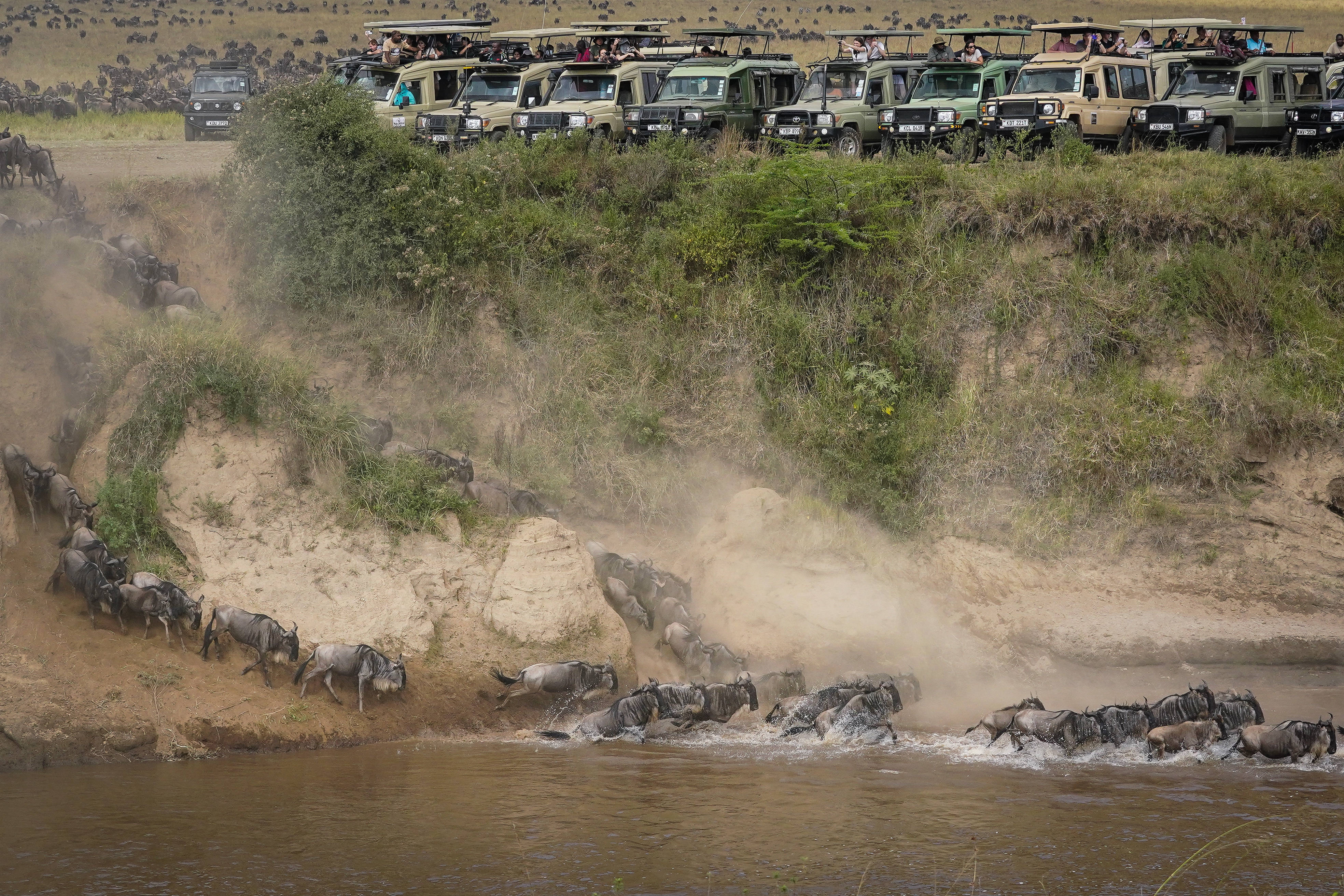 2025年7月30日,在肯尼亚马跑马拉国度保护区,成群的角马谀媚在马拉河滨准备渡河。