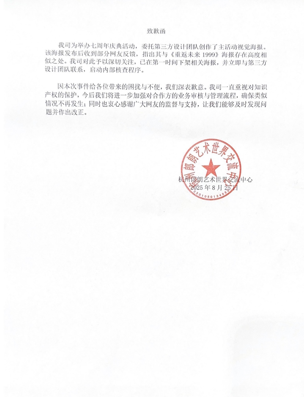 同期,记者注重到郎朗某外交平台账号,已将该争议海报删除。25日下昼,杭州郎朗艺术宇宙交流中心发布《致歉函》,写说念:我司为举办七周年典礼四肢,托福第三方商量团队创作了主四肢视觉海报。该海报发布后收到部分网友反馈,指出其与《重返改日1999》海报存在高度相似之处。我司对此赐与深化关心,已在第一本事下架有关海报,独立即与第三方商量团队干系,运转里面核查标准。