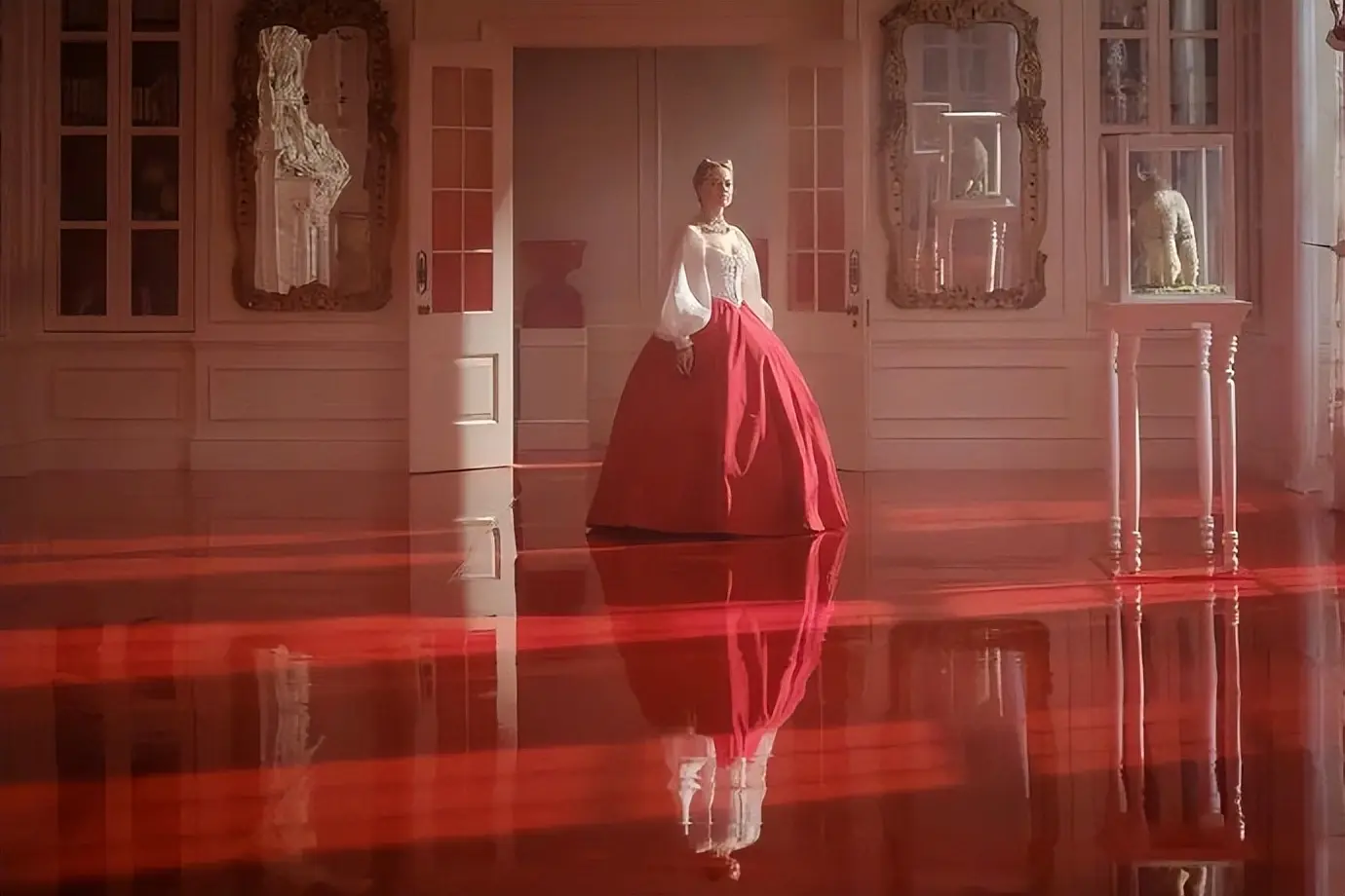 相沿者将其捧为“暗黑好意思学巅峰”。影片中,凯瑟琳的51套戏服被极致简化为黑、白、红三色,那袭猩红长裙被视为她野性本能的喷薄;画眉田庄的墙纸竟复刻了演员的皮肤纹理,庄园微缩模子则暗喻东说念主物如同“红运玩偶”。这种强烈的标志化视觉,被赞“每一帧王人是视觉诗”。更关节的是,影片对情欲戏的描写被好多女性不雅众解读为对男权规则的解构与拒抗,柏林首映时现场女性的落泪与共识,成为其厚谊力量的最好注脚。
