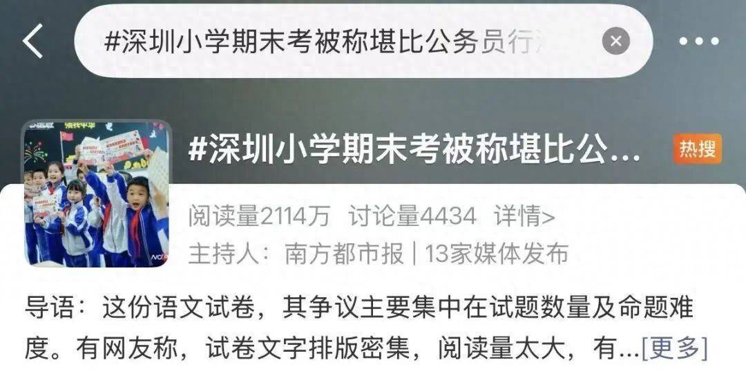 话题#深圳小学期末考被称堪比公事员行测#一度冲上热搜——